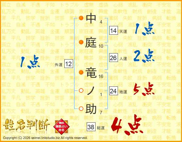中庭竜ノ助さんの総運は38画の4点!