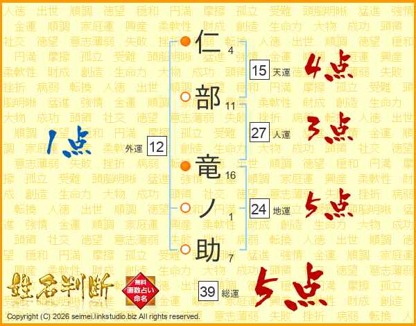 仁部竜ノ助さんの総運は39画の5点!