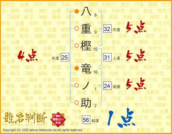 八重樫竜ノ助さんの総運は56画の1点!