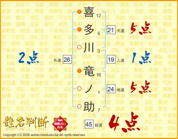 喜多川竜ノ助さんの総運は45画の4点!
