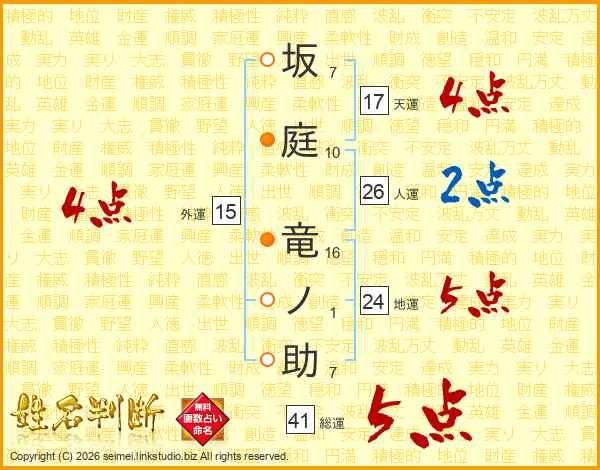 坂庭竜ノ助さんの総運は41画の5点!