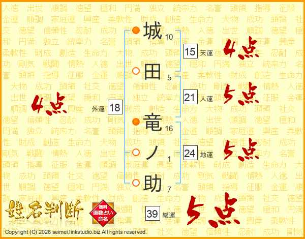 城田竜ノ助さんの総運は39画の5点!