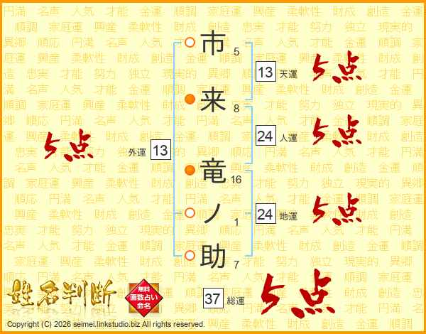 市来竜ノ助さんの総運は37画の5点!