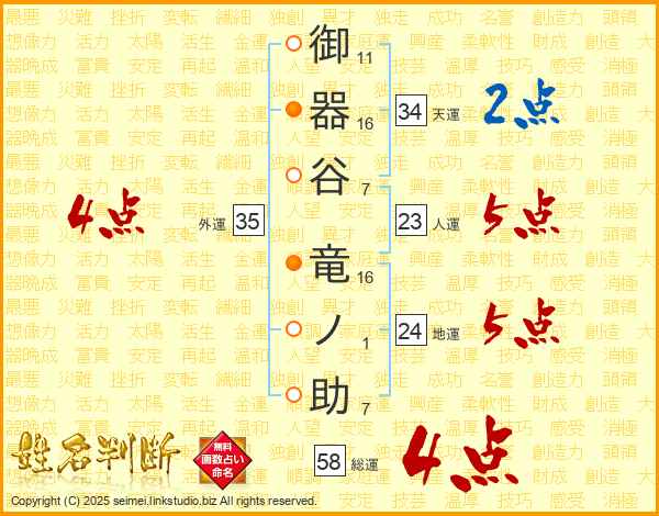 御(11画)器(16画)谷(7画) 竜(16画)ノ(1画)助(7画)