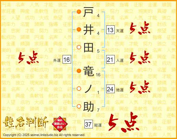 戸(4画)井(4画)田(5画) 竜(16画)ノ(1画)助(7画)
