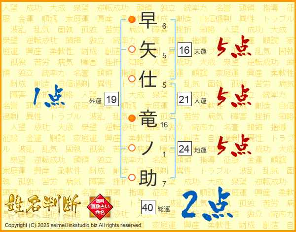 早(6画)矢(5画)仕(5画) 竜(16画)ノ(1画)助(7画)