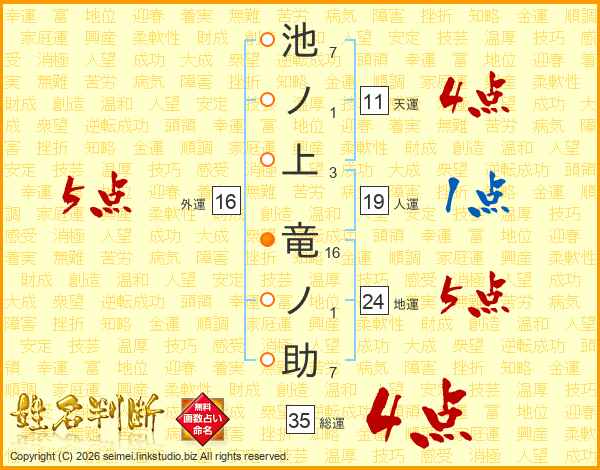 池ノ上竜ノ助さんの総運は35画の4点!