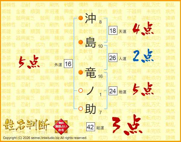 沖(8画)島(10画) 竜(16画)ノ(1画)助(7画)