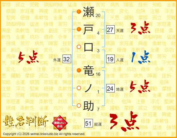 瀬戸口竜ノ助さんの総運は51画の3点!