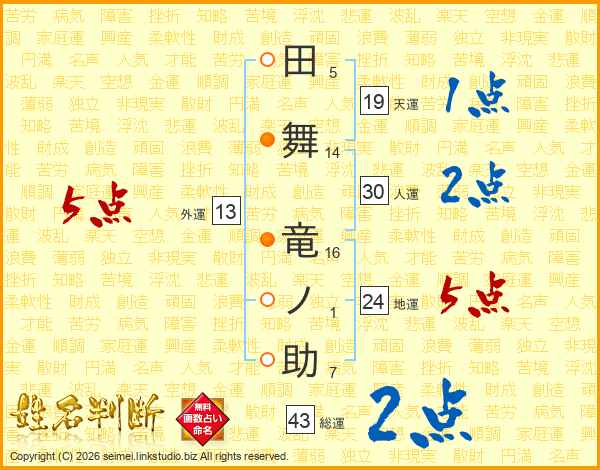 田舞竜ノ助さんの総運は43画の2点!