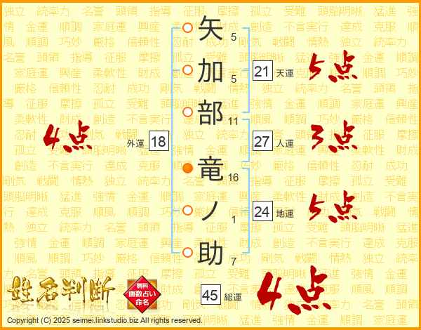 矢(5画)加(5画)部(11画) 竜(16画)ノ(1画)助(7画)