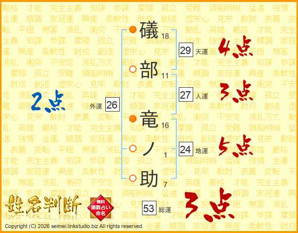 礒(18画)部(11画) 竜(16画)ノ(1画)助(7画)
