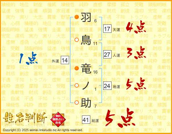 羽(6画)鳥(11画) 竜(16画)ノ(1画)助(7画)
