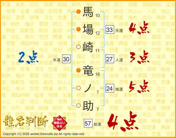 馬(10画)場(12画)崎(11画) 竜(16画)ノ(1画)助(7画)