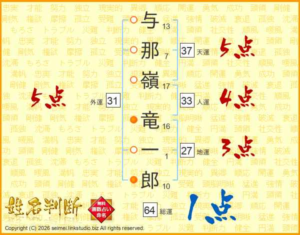 与(13画)那(7画)嶺(17画) 竜(16画)一(1画)郎(10画)