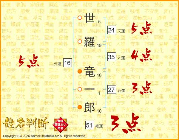 世(5画)羅(19画) 竜(16画)一(1画)郎(10画)