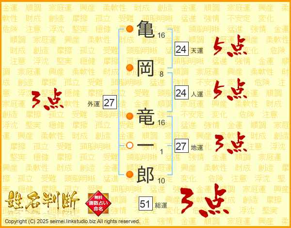 亀(16画)岡(8画) 竜(16画)一(1画)郎(10画)