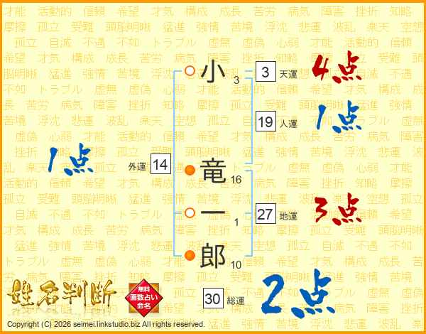 生活面を象徴する運勢です。外部から受ける影響力を表し、結婚運、家庭運や職場、環境への順応性を表します。総運から人運を引いた画数。姓や名が1文字の場合を除く。