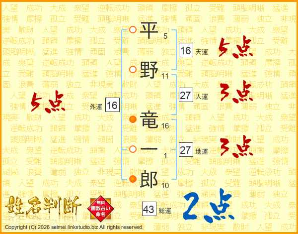 平(5画)野(11画) 竜(16画)一(1画)郎(10画)