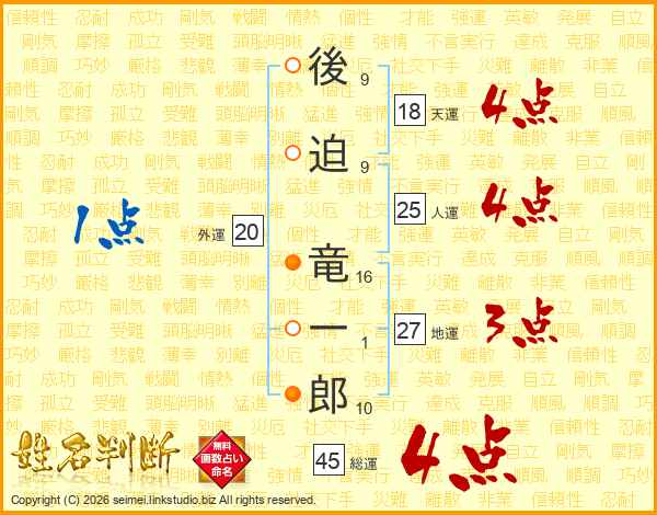 後(9画)迫(9画) 竜(16画)一(1画)郎(10画)