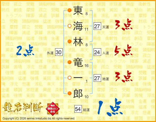 東(8画)海(11画)林(8画) 竜(16画)一(1画)郎(10画)
