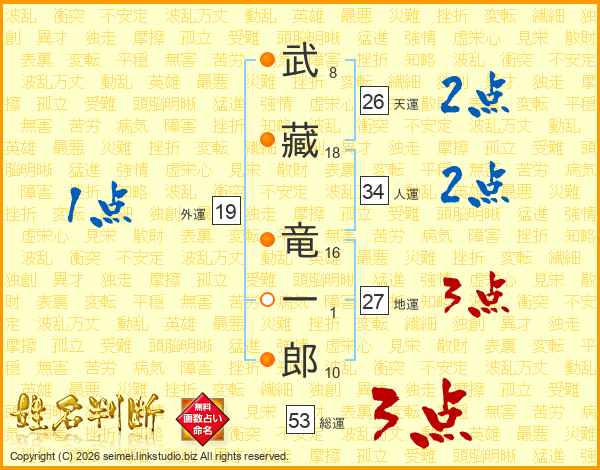 武(8画)藏(18画) 竜(16画)一(1画)郎(10画)