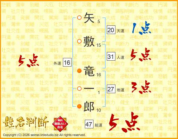 矢(5画)敷(15画) 竜(16画)一(1画)郎(10画)