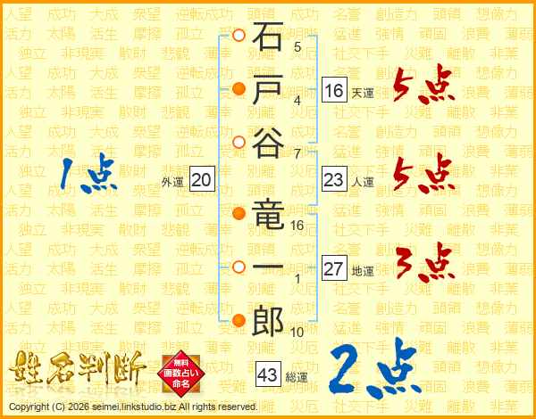 石(5画)戸(4画)谷(7画) 竜(16画)一(1画)郎(10画)