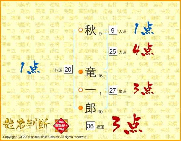 秋(9画) 竜(16画)一(1画)郎(10画)