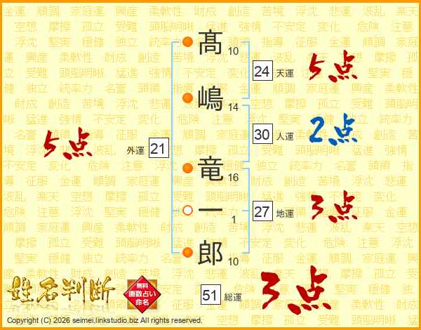 髙(10画)嶋(14画) 竜(16画)一(1画)郎(10画)