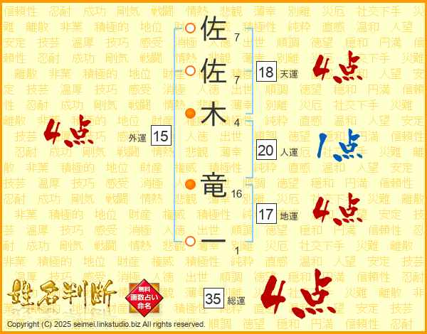佐佐木竜一さんの総運は35画の4点!