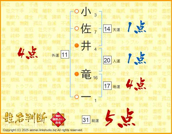 小(3画)佐(7画)井(4画) 竜(16画)一(1画)