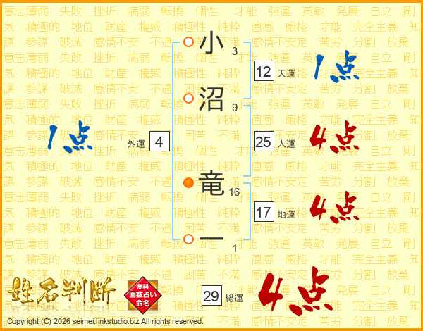 小沼竜一さんの人運は25画の4点!