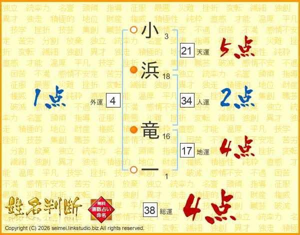 生活面を象徴する運勢です。外部から受ける影響力を表し、結婚運、家庭運や職場、環境への順応性を表します。総運から人運を引いた画数。姓や名が1文字の場合を除く。