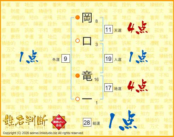 岡(8画)口(3画) 竜(16画)一(1画)