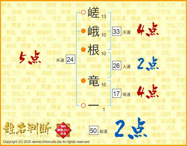 嵯(13画)峨(10画)根(10画) 竜(16画)一(1画)