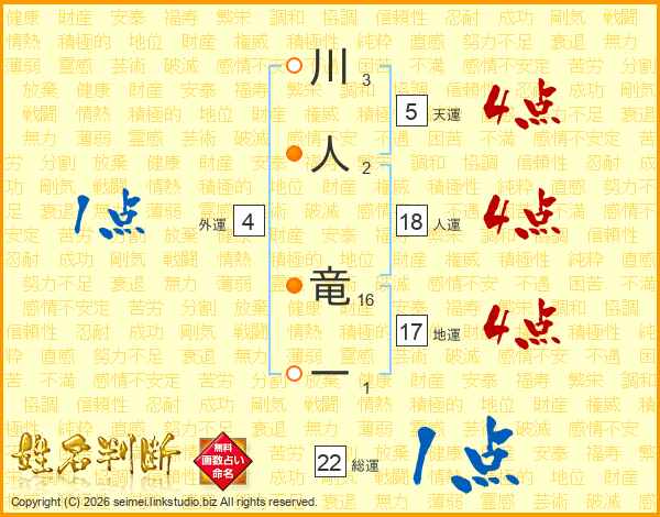 生活面を象徴する運勢です。外部から受ける影響力を表し、結婚運、家庭運や職場、環境への順応性を表します。総運から人運を引いた画数。姓や名が1文字の場合を除く。