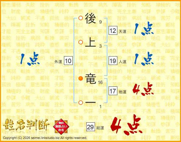 生活面を象徴する運勢です。外部から受ける影響力を表し、結婚運、家庭運や職場、環境への順応性を表します。総運から人運を引いた画数。姓や名が1文字の場合を除く。
