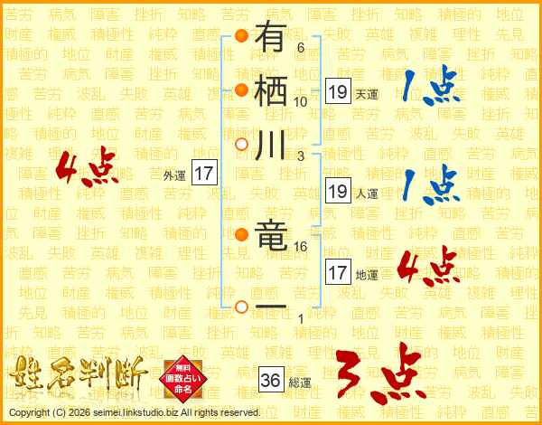 有(6画)栖(10画)川(3画) 竜(16画)一(1画)