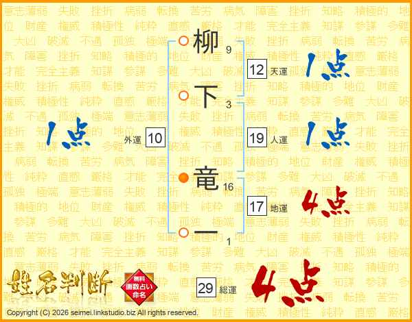 画数の奇数(○陽)と偶数(●陰)の配列で吉凶を占います。どちらかにかたよる名前は大凶名で避ける必要があります。画数の奇数偶数。