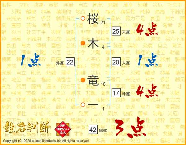 生活面を象徴する運勢です。外部から受ける影響力を表し、結婚運、家庭運や職場、環境への順応性を表します。総運から人運を引いた画数。姓や名が1文字の場合を除く。