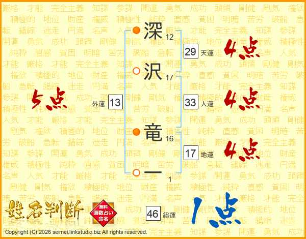 あなたの人生を表す1番重要な運勢です。生涯を通じて影響する総合運となり、主に50歳以降の晩年期に影響を及ぼします。苗字と名前の合計画数。