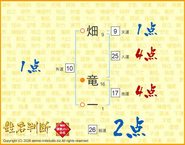 生活面を象徴する運勢です。外部から受ける影響力を表し、結婚運、家庭運や職場、環境への順応性を表します。総運から人運を引いた画数。姓や名が1文字の場合を除く。