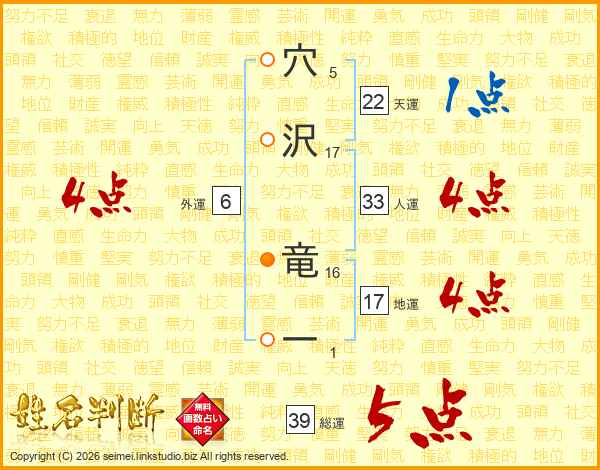 穴沢竜一さんの総運は39画の5点!