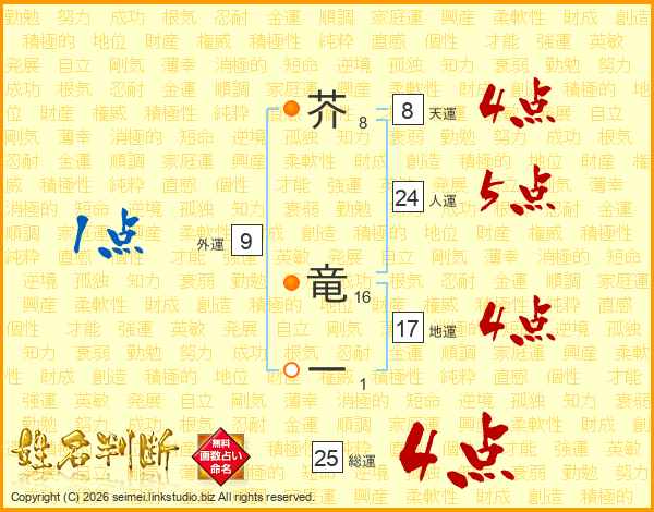生活面を象徴する運勢です。外部から受ける影響力を表し、結婚運、家庭運や職場、環境への順応性を表します。総運から人運を引いた画数。姓や名が1文字の場合を除く。