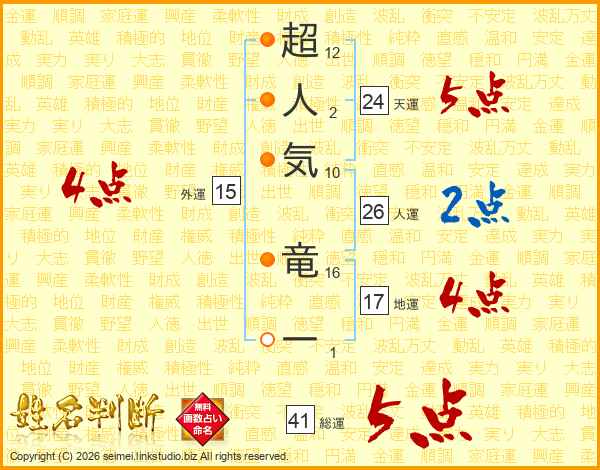 超(12画)人(2画)気(10画) 竜(16画)一(1画)