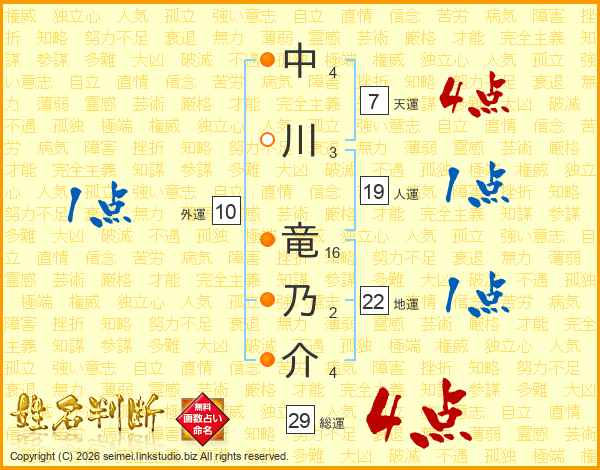 中(4画)川(3画) 竜(16画)乃(2画)介(4画)