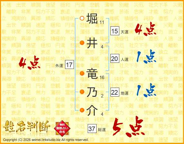 堀(11画)井(4画) 竜(16画)乃(2画)介(4画)