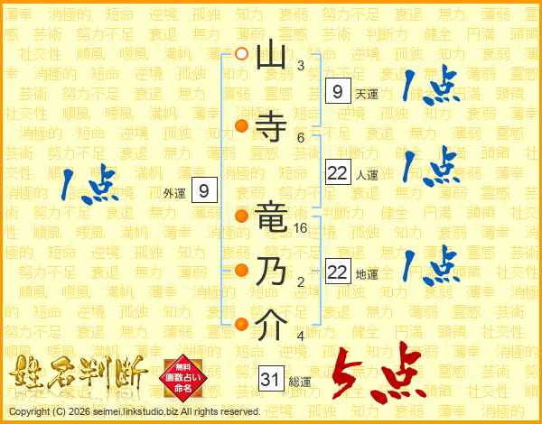 山寺竜乃介さんの総運は31画の5点!