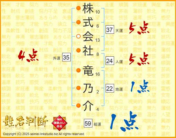株式会社竜乃介さんの総運は59画の1点!